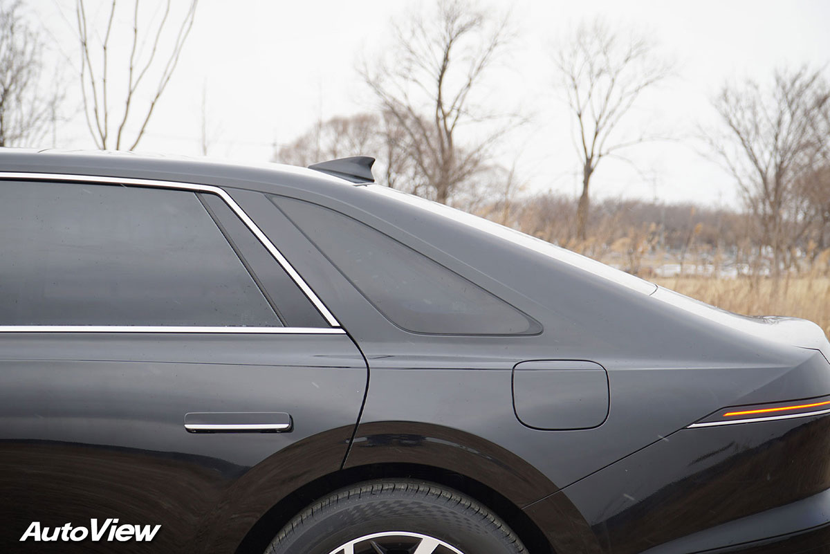 C-필러에는 오페라 글래스도 추가됐다. 1세대 그랜저를 연상시키는 디자인. 보통 C-필러에 유리창이 추가되는 모델은 뒷좌석 탑승 중심의 차라는 이미지를 보여준다. 현 세대 그랜저의 포지션을 보여주는 부분이다.