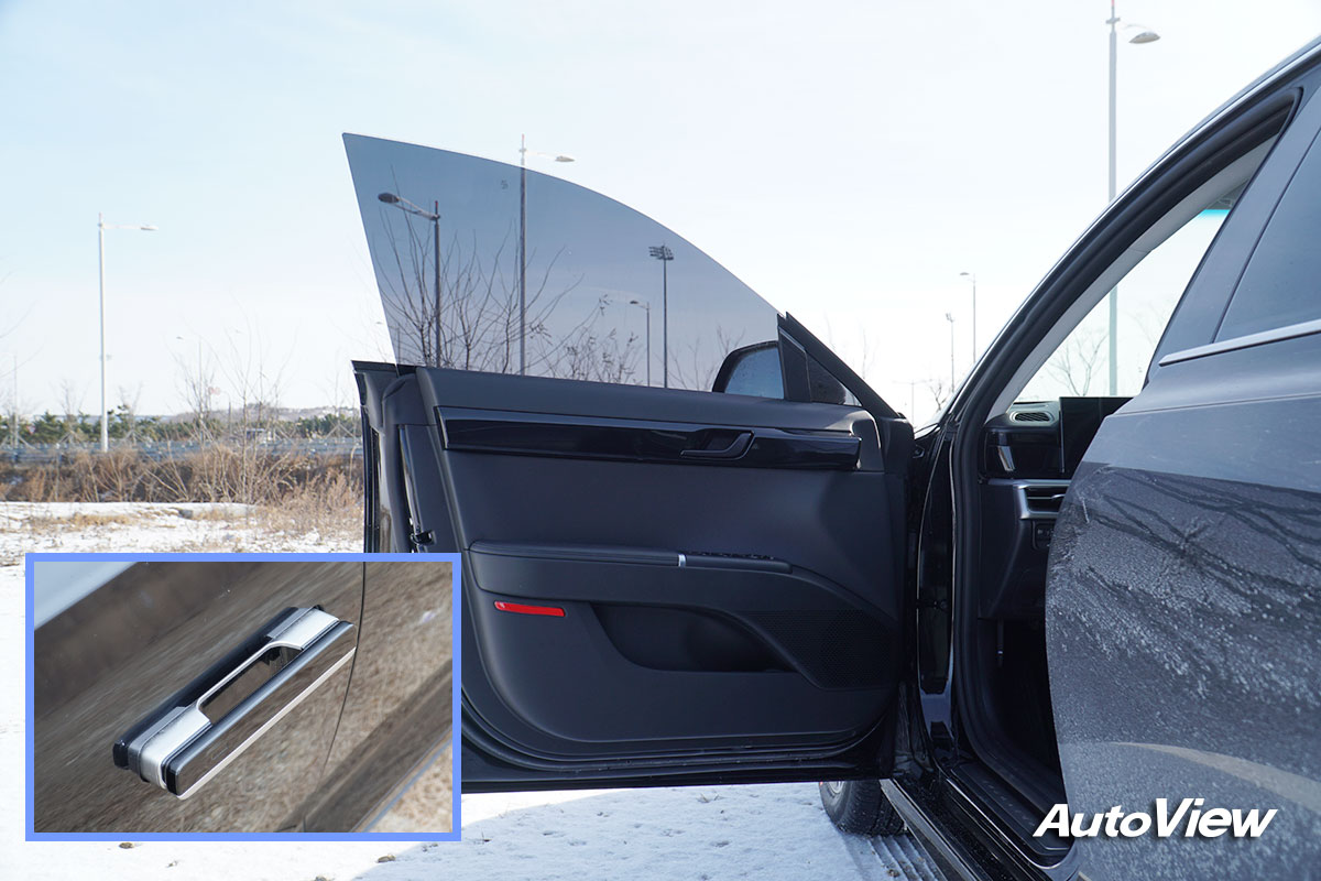 플러시 도어 핸들, 프레임리스 도어는 최신 트렌드를 반영한 결과다. 현대차는 프레임리스 도어를 96년 스포티 쿠페 티뷰론에서 처음 썼다. 그랜저에 사용된 것은 3세대 XG 시절 때였고, 7세대에 와서 다시 프레임리스 타입을 택했다. 처음 사용 때보다 견고한 모습을 보이는데, 덕분에 장시간 사용해도 윈도의 떨림 등이 쉽게 나타나지 않을 듯하다.