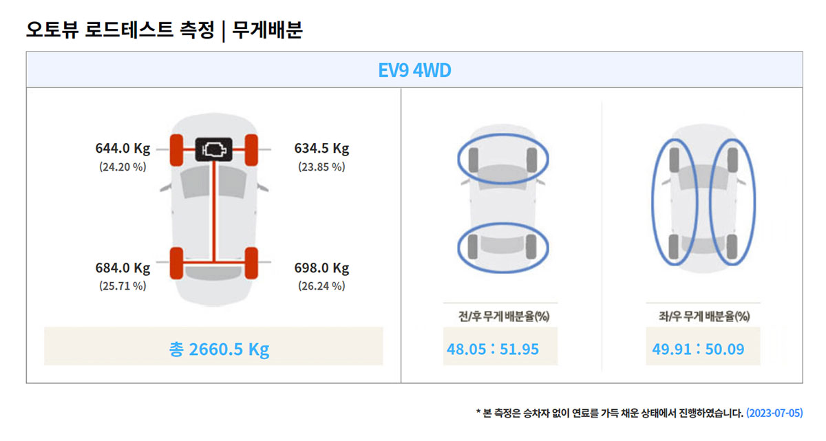 차체는 무겁다. 실측을 해보니 2,660kg 정도였다. 100kWh에 육박하는 배터리를 품었으니 그럴 만도 하다. 성인 1명만 탑승해도 2.7톤을 넘고 EV9이 원하는 다인 승차환경에 맞추면 차량의 중량은 최대 2.9톤을 넘어선다.