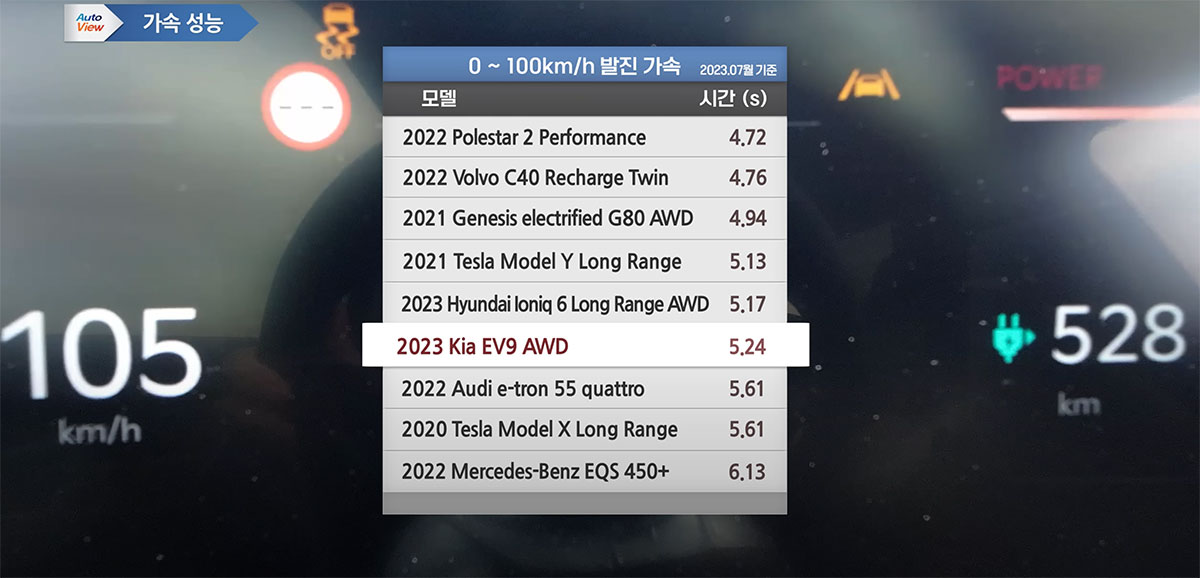 정지 상태에서 100km/h까지의 가속 시간을 측정했다. 기아는 부스트 모드 이용 시 5.3초가 소요된다고 발표했다. 실측 결과는 5.24초였다. 체감 보다 실제 성능이 더 잘 나왔다. 이후에도 가속 페달을 밟고 있으면 200km/h 돌파도 가능하다. 다만 전기모터 특성상 고회전 영역에서 추가적인 힘을 발휘하기 어렵다 보니 160km/h 이후부터 가속 성능이 떨어지기 시작한다.
