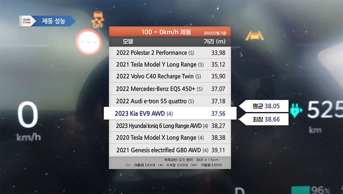 제동 성능도 시험했다. 100km/h에서 완전히 정지하는데 소요된 최단 거리는 37.56m. 차급과 무게를 생각하면 좋은 수준이다. 테스트를 반복해도 브레이크가 쉽게 지치는 모습도 없었다. 5회 시험 기준 최장 제동거리는 38.66mm였으며, 평균 제동거리는 38.05m였다. 무게 대비 브레이크 시스템 용량은 부족하지 않다는 것이다. 또한 타이어가 잘 버텼기에 이런 지속성이 나온 것이다.