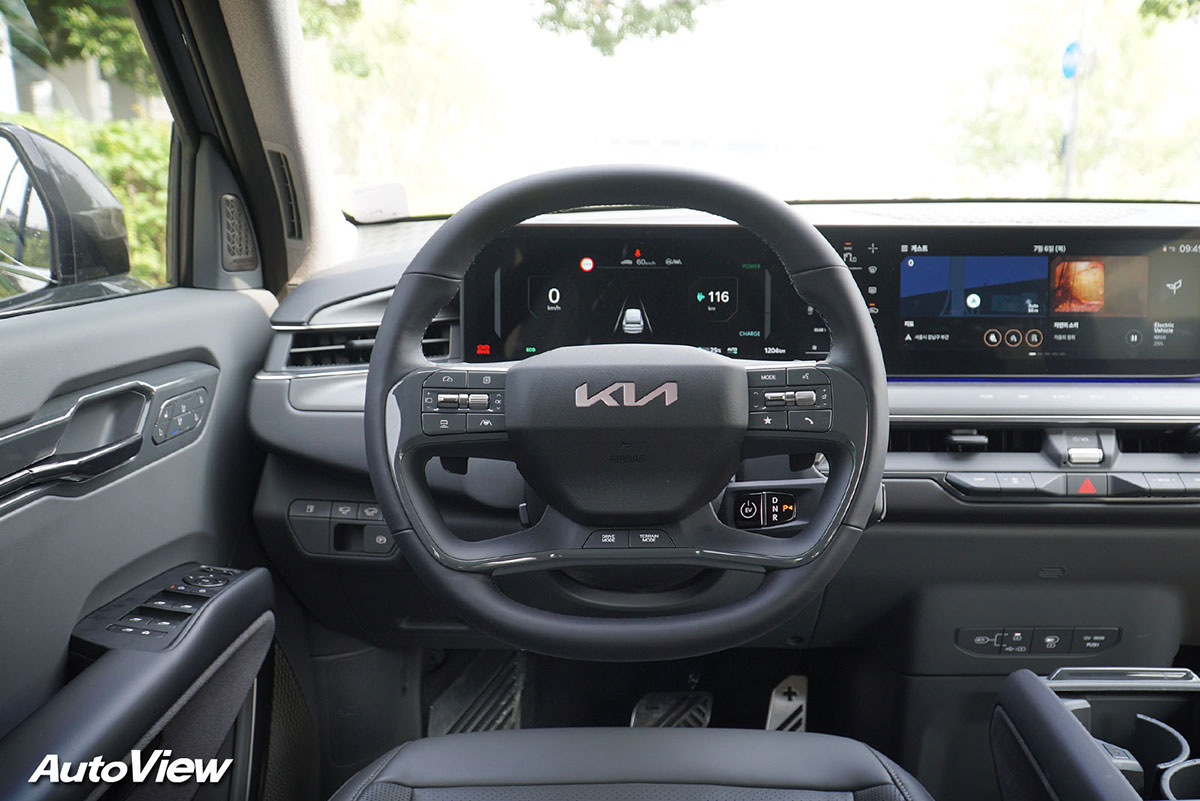 공간에 대한 인상을 제외하고도 실내에 들어섰을 때 새롭게 느껴지는 것이 2가지나 있다. 첫 번째, 버튼 배치 구조가 기존 기아차와 다르다. 시동 버튼은 칼럼식 기어 레버에 통합됐다. 통풍, 열선, 스티어링 열선 조작 버튼도 도어 패널로 자리를 옮겼다. 주행 모드와 터레인 모드 버튼은 스티어링 6시 방향에 위치한다. 12.3인치 계기판과 인포테인먼트 모니터 사이에 5인치 공조에 터치패널도 추가했다.