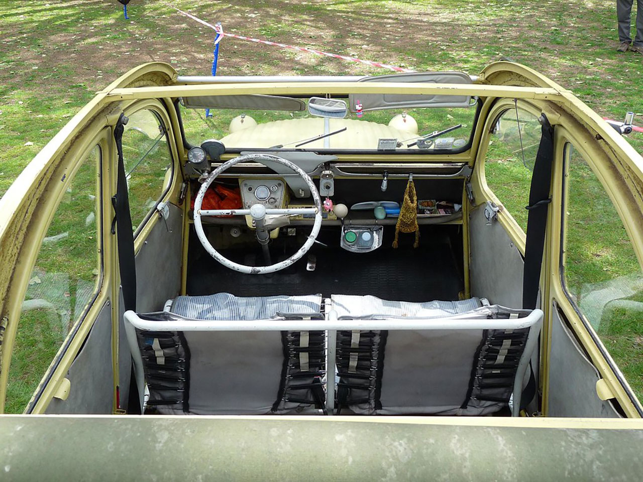 자세히 들여다보면 비용 절감을 위한 흔적들을 엄청나게 발견할 수 있다. 가령 유리창을 도어 안으로 밀어 넣는 방식이 아니라 위로 접어 올리는 방식만 해도 그렇다. 시트는 캔버스 천 안쪽에 고무줄로 적당히 텐션을 주는 식이었고, 시트 프레임은 그저 파이프를 구부려 만든 수준이었다. 그도 그럴 것이 이 차는 프랑스 시골에서 거의 농기계처럼 운영할 수 있는 소박한 자동차라는 개념으로 설계했기 때문이다.