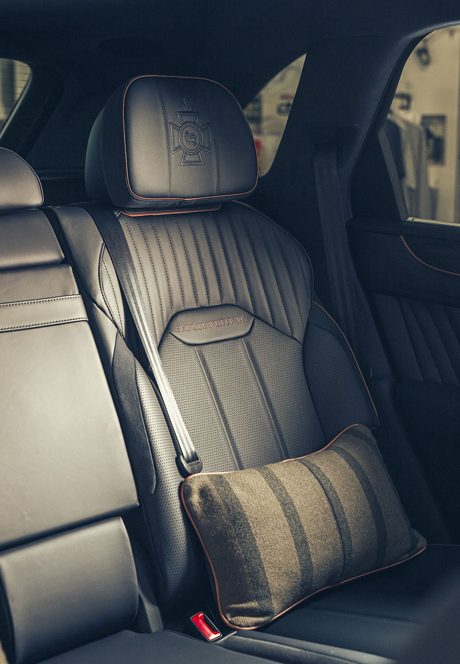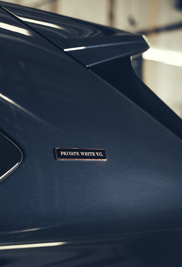이제 대부분의 의문이 풀렸을 것이다. 프라이빗 화이트 VC라는 이름을 해석해 보면 빅토리아 십자 훈장 수훈자 잭 화이트 이병이라는 뜻이다. 그리고 벤테이가 실내를 장식하고 있던 코퍼 레드는 구리 선을 감고 배 바깥으로 뛰어내렸던 그의 공적을 기리는 색상이었다. 또한 리어 시트에 놓인 쿠션은 잭 화이트가 근무한 연대에서 사용했던 담요에 새겨진 스트라이프를 그대로 재현한 것이라 한다.