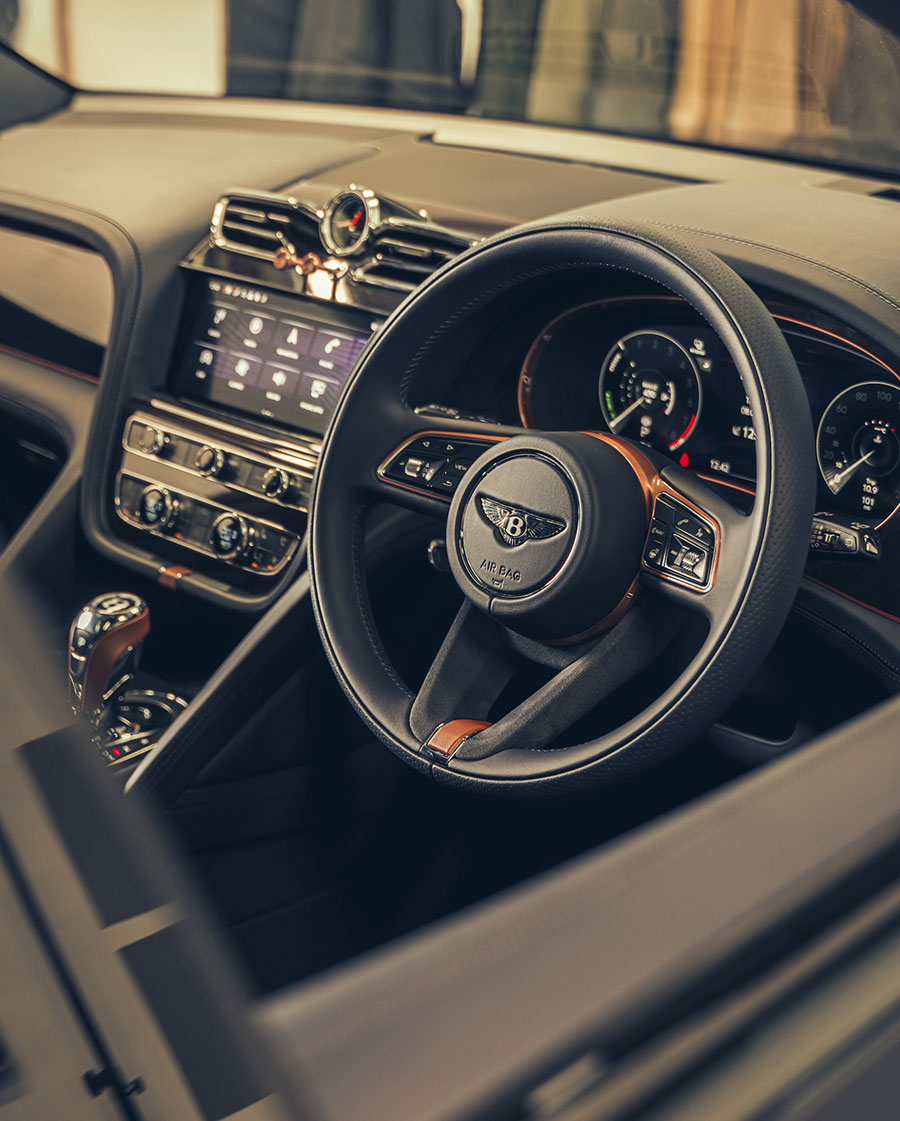 실내에는 익스테리어 컬러와 비슷한 짙은 네이비가 대부분을 차지하고 있다. 헤드레스트에는 십자가 장식이 각인되어 있는 시트는 네이비와 보색을 이루는 코퍼 레드 (Copper Red) 파이핑으로 마감했다. 그런데 에어 벤트 스위치를 비롯해 스티어링 휠 스포크, 대시보드 베니어를 가로지르는 선, 기어 노브 등 시트 말고도 코퍼 레드가 곳곳에서 발견된다. 반면 도어 트림에 새겨진 불도그 자수가 전반적으로 무겁고 진지하기만 한 실내의 분위기를 환기시킨다.