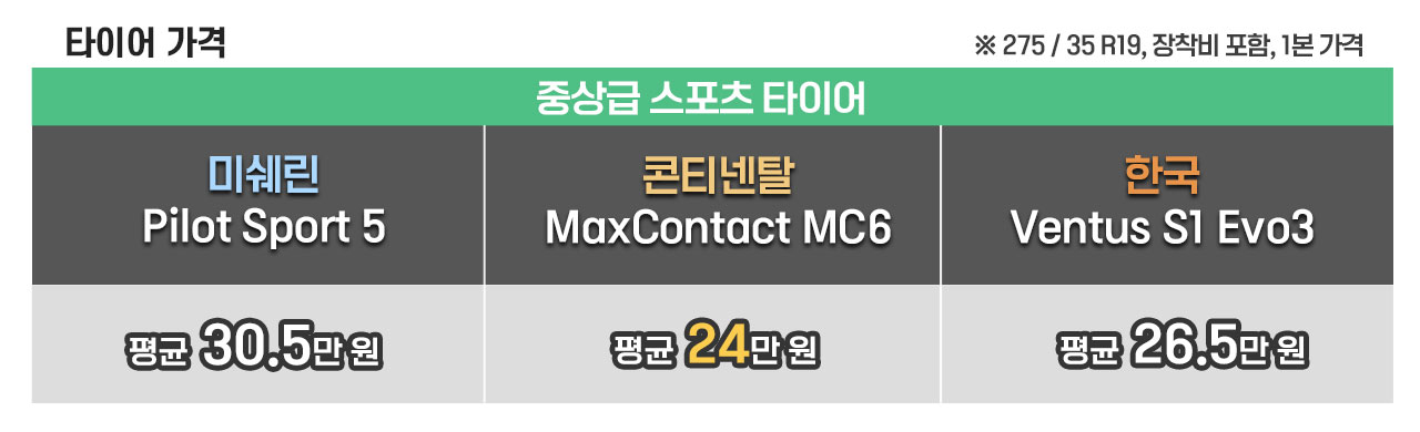 규격(사이즈)에 따라 다르지만 요즘 고성능 타이어들의 가격은 50만 원대 혹은 그 이상을 쉽게 넘나든다. 일부 OE 타이어는 1본 당 100만 원을 넘어선다. 상황이 이렇다 보니 가성비 좋은 제품들을 찾는 소비자층도 많아졌는데, 여기서의 가성비 타이어란 단순히 가격이 저렴함 것이 아닌 적정 성능과 타협할 수준의 가격을 가진 제품들을 의미한다. 예를 들어 시장서 인기 많은 브리지스톤의 포텐자 RE004, 한국 V12 EVO2, 금호 PS71 등급의 입문형 타이어가 100~300마력 급 차량에서 가성비 좋은 타이어로 꼽힌다면 오늘 비교하는 타이어들은 200~400마력대 성능을 가진 자동차에서 쓸만한 타이어들이다. 물론 더 높은 출력을 가진 차에도 사용은 가능하지만 통상 이런 차들에는 미쉐린 PS4S, 콘티넨탈 스포트콘택트7, 한국 EVO Z 등의 최상등급 타이어들이 널리 쓰인다.