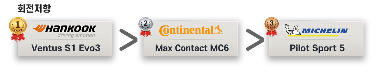 여기서는 드디어 에보3가 1위에 올랐다. 그러나 2위와 오차 내외의 수준이라 동일한 점수를 득하게 됐다. PS5는 그립이 좋았기 때문인지 다른 타이어 대비 상대적으로 저항이 많았다.