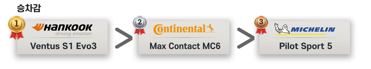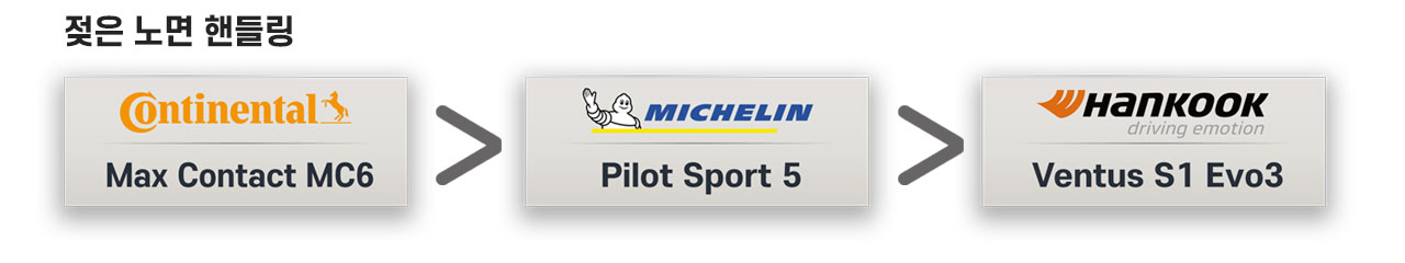 국내 대표 중에서는 한국 타이어의 벤투스 S1 evo3(이하 evo3)를 가져왔다. 이 타이어는 고성능 타이어인 evo2의 후속격 모델인데 evo2 보다 성능이 살짝 부족하다는 평가가 많았다. 벤투스 EVO Z가 한국 타이어의 최상위 모델로 자리하면서 자연스레 등급이 하나 떨어져 중상급 제품군이 됐다.