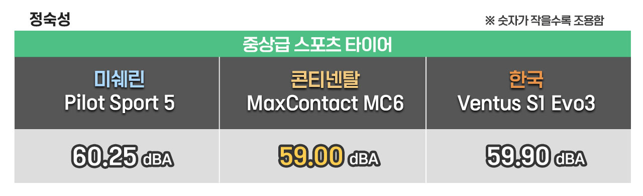 정숙성은 2개 노면을 대상으로 했는데, 여기서는 MC6가 가장 뛰어난 정숙성을 보였다. 그리고 에보3가 2위로 올라섰다. 1위와 격차는 조금 크 편이지만 그래도 선방했다. 반면 지금껏 상위권을 랭크 하던 PS5가 가장 소음을 가진 것으로 나타났다.