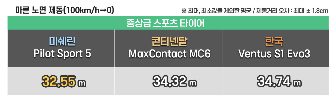 이제 본격 성능을 보자. 국내 소비자들이 관심이 많은 것은 마른 노면 성능이다. 그래서 이 영역을 중점적으로 테스트했다.