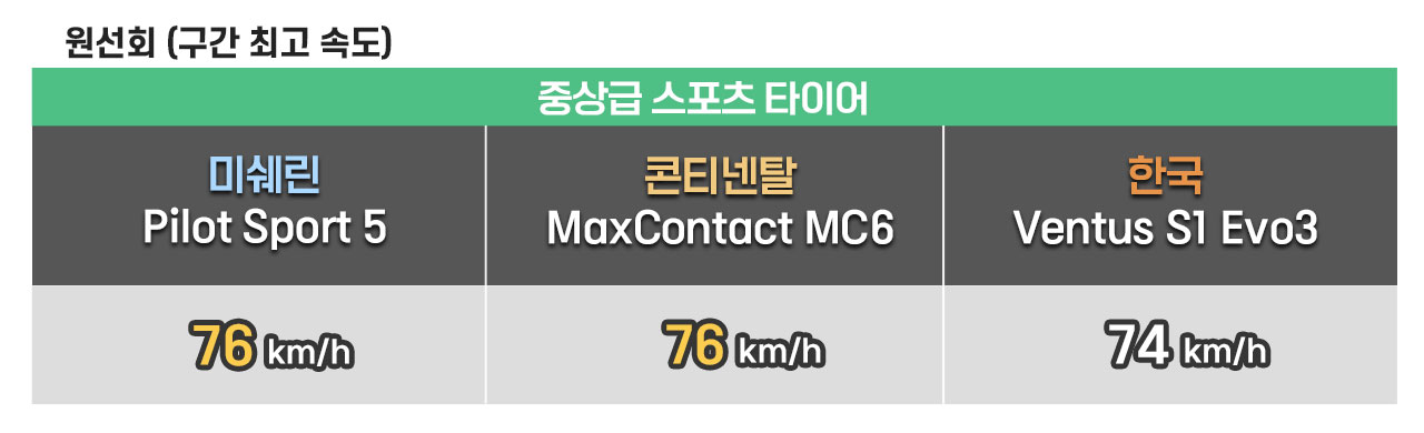이번에는 선회로에서 횡 방향으로 버티는 능력을 보자. 코너링 한계라고 생각하면 쉽다. 여기서는 PS5와 MC6가 같은 수준인 약 76km/h 내외의 한계 속도를 보였다. 반면 에보3는 이들 보다 2km/h 한계 속도가 낮았다. 코너링 한계만 보면 제법 성능 차이가 난다.
