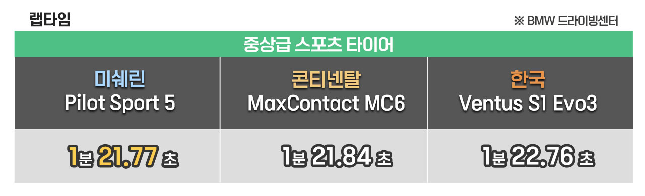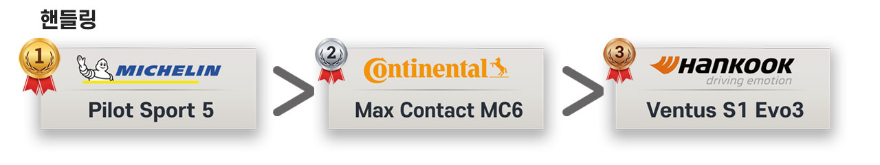이렇게 중상 등급 타이어 중에서 가장 좋은 성능을 가진 것은 PS5로 나왔다. 고성능 차를 보유했거나 보다 빠른 코너링에 관심이 큰 소비자에게 PS5는 좋은 파트너가 될 것이다. MC6도 가격 대비 좋은 성능을 냈다. 또한 후속 모델 MC7의 데뷔를 앞두고 있기에 PS5와의 한판 승부가 기대된다.