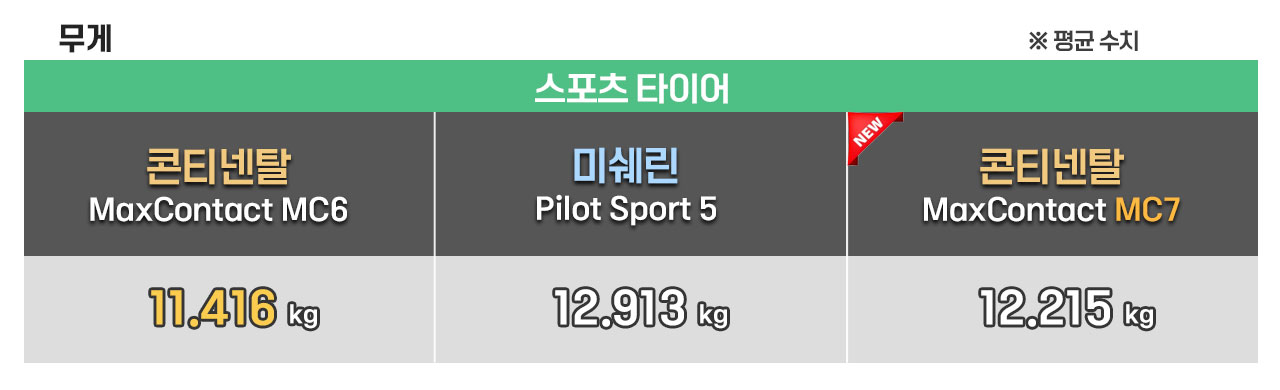 측정 결과 MC6가 가장 가벼웠으며 가장 무거운 것은 PS5였다. 이 두 타이어의 무게 차이는 본당 약 1.5kg 수준으로 출력이 낮은 차에 사용될 경우 가속력 차이를 크게 실감하게 된다. MC7은 이들의 중간 12.2kg 수준을 보였는데, 타이어 내부 소재 변경 때문인지 무게가 많이 늘었다.