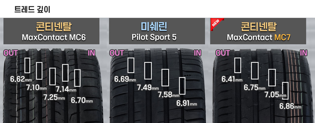 홈이 가장 깊은 것은 PS5였는데, 중앙부를 기준으로 약 7.5mm 내외를 보였고, MC6가 7.25mm, MC7이 7mm 내외로 가장 얇은 트레드를 갖고 있는 것으로 나타났다.