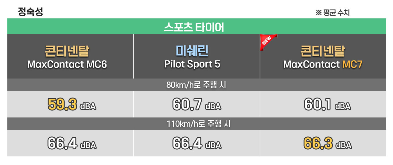 이번에는 일반 노면을 기준으로 시속 110km로 달려보자. 여기서는 다른 결과가 나왔는데, MC7의 소음이 가장 적은 66.3 dBA를 기록했다. 그리고 PS5, MC6가 유사한 수준인 66.3 dBA를 기록했다. 0.1dBA 정도는 오차 범위다.