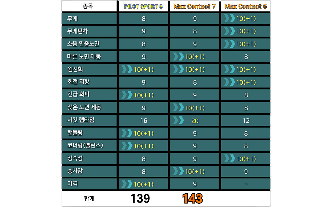 이렇게 중상급 타이어 테스트가 끝났다. 그리고 최종적으로 가장 높은 점수를 득한 것은 콘티넨탈 맥스콘택트 MC7이었다. 미쉐린 입장에서는 아쉽겠지만 콘티넨탈은 미쉐린 PS5를 경쟁 리스트 1순위에 두고 개발, 튜닝을 해왔을 것이다. 이런 결과가 노력에 대한 최소한의 보상이랄까? 이렇게 우리는 현시점에서 중상등급 최고 모델로 콘티넨탈의 맥스콘택트 MC7을 최고의 타이어로 꼽았다.