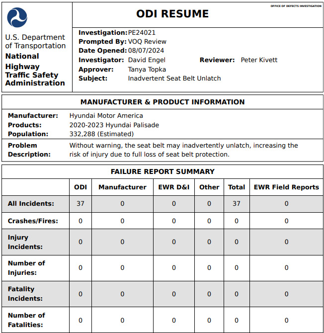 이에 따라 NHTSA는 미국 시장에서 판매된 2020에서 2023년형 팰리세이드 33만 2288대에 대해 예비 평가(Preliminary Evaluation)를 시작했다. NHTSA는 예비 평가 후 조사 확대 여부를 결정한다. 필요할 경우 차량 제조사에 리콜을 요구할 수 있다.