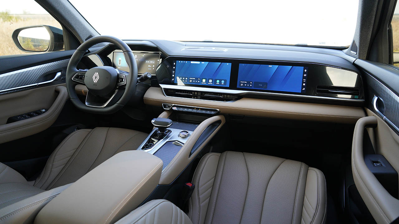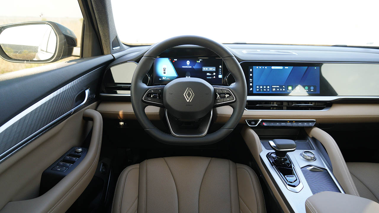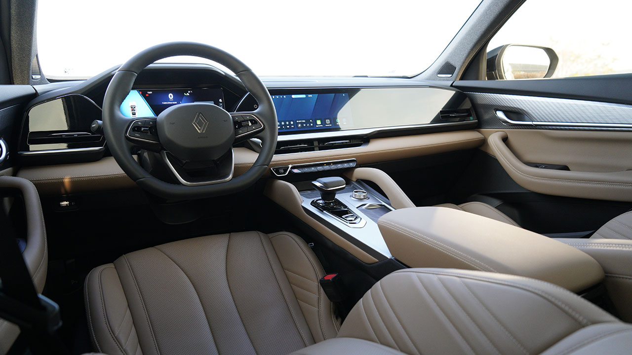 실내는 오픈 R 파노라마 스크린을 중심에 둔 모습이다. 동급 경쟁 차종 중 보조석 디스플레이도 르노 콜레오스의 강점이다. 12.3인치의 메인 인포테인먼트 디스플레이와 독립 작동한다. 계기판 디자인은 하이브리드 모델과 큰 차이는 없지만 바(Bar)형태의 RPM 게이지가 적용되어 있다.