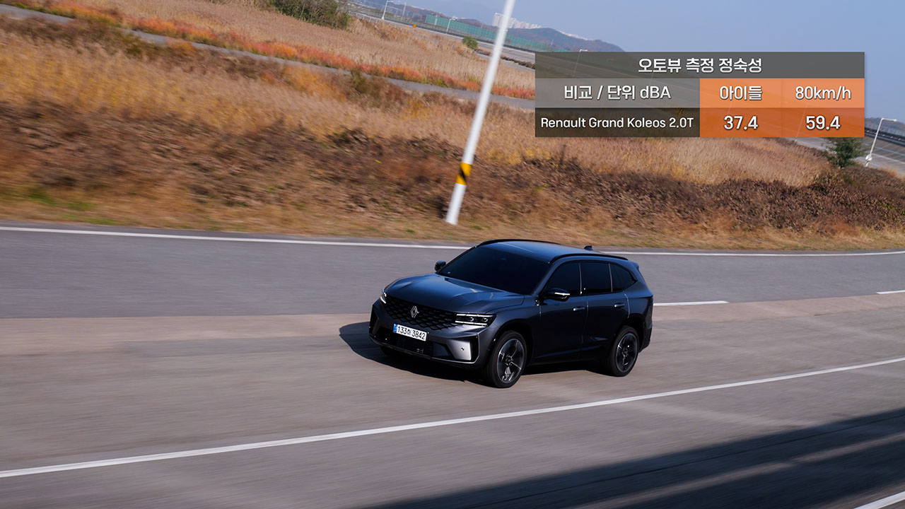 80km/h 주행 소음은 59.4dBA이 계측됐다. 동급 모델과 비교했을 때 조용한 편이다. 싼타페 하이브리드의 주행 소음은 60.3dBA, 쏘렌토 하이브리드가 59.7dBA였으며 싼타페 2.5 가솔린 터보 모델은 동일 노면에서 60.4dBA를 기록한 바 있다. 동일한 차체에 파워트레인이 다를 뿐인 콜레오스 하이브리드도 같은 소음값 59.4dBA가 계측됐다는 것도 재미있다.