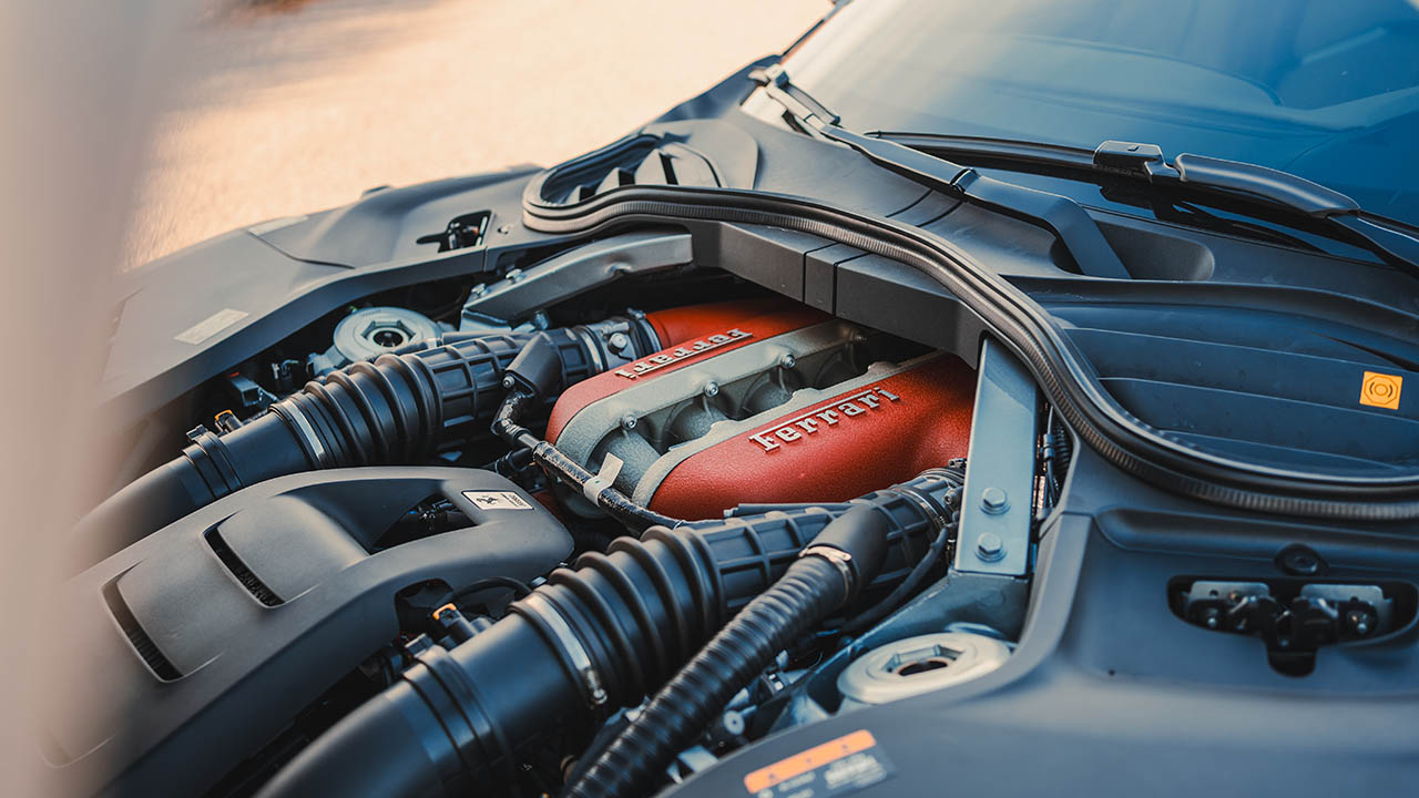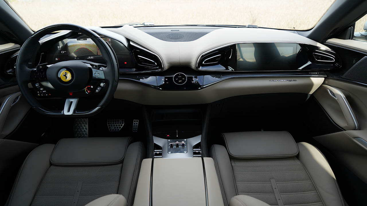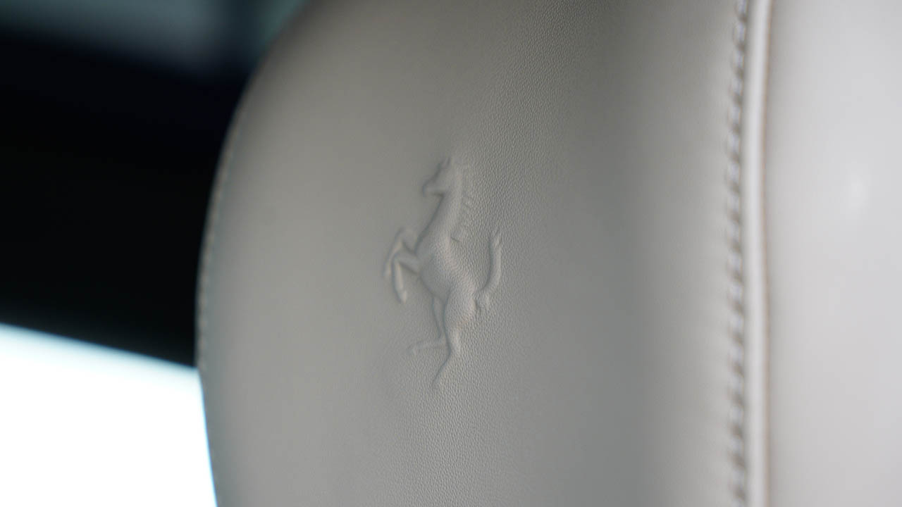 실내에 쓰인 소재는 가죽, 알루미늄, 카본파이버, 하이그로시 소재가 주를 이룬다. 시승차는 토르토라(Tortora) 컬러의 가죽으로 감싸져 화사하고 고급스러운 실내 분위기를 냈다. 시트도 동일한 색상으로 페라리 엠블럼이 양각으로 새겨진 헤드레스트를 비롯해 알칸타라와 알루미늄을 디테일 요소로 삽입했다.