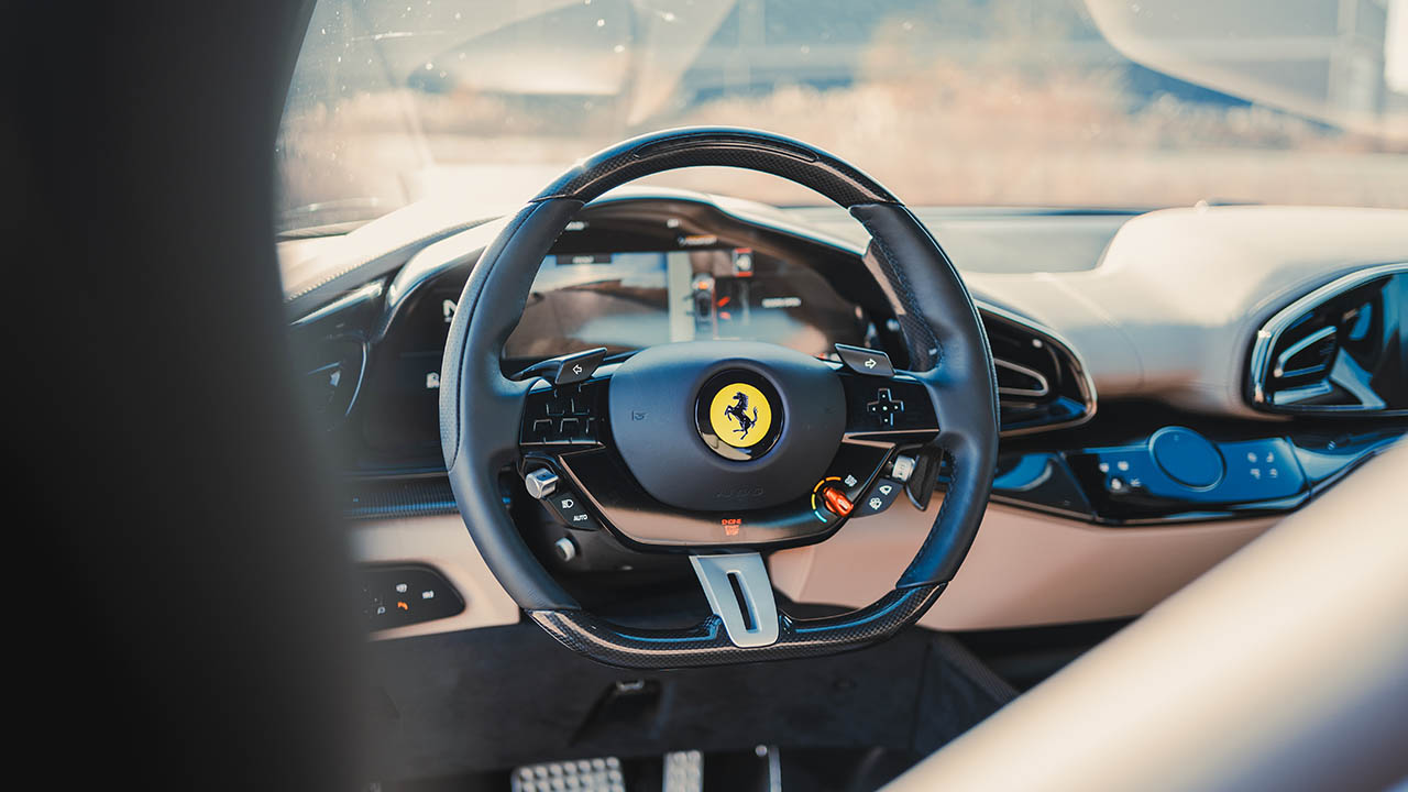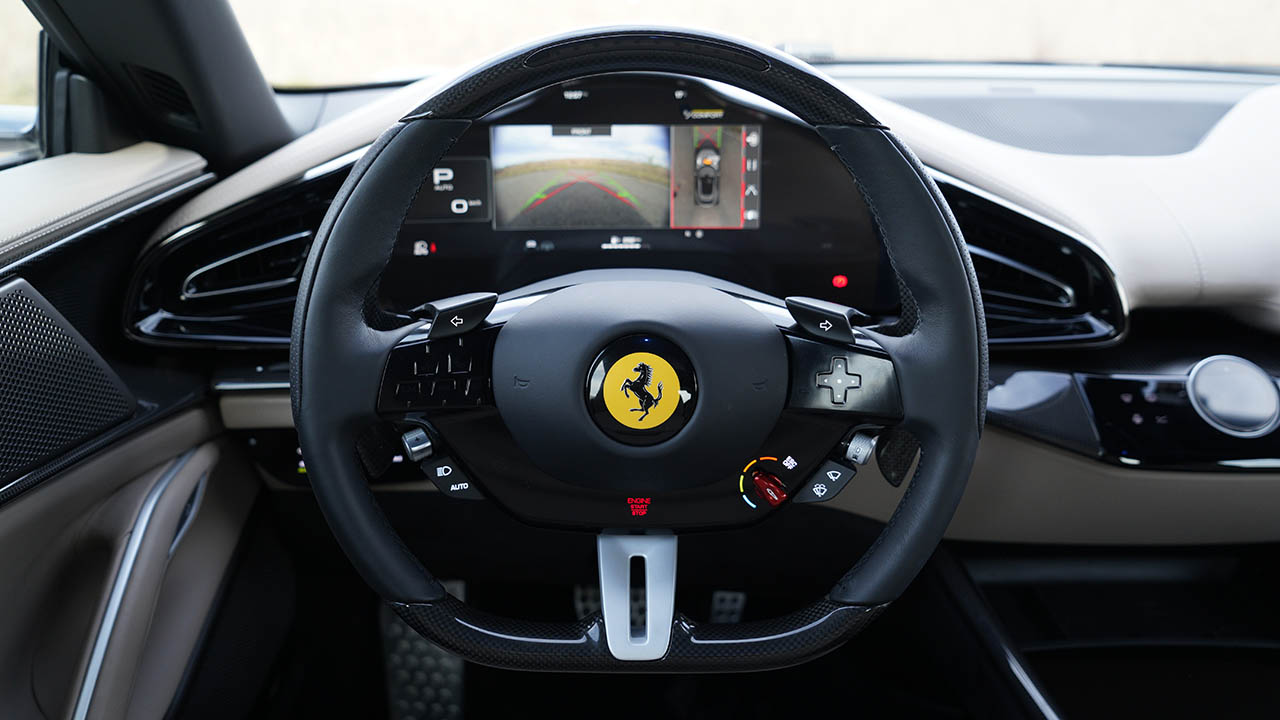 페라리는 스티어링에서 손을 떼지 않고 주행 중 필요한 필수적인 기능들을 수행할 수 있는 독특한 인터페이스를 갖고 있다. 스티어링 휠에는 엔진 스타트 터치 버튼, 방향 지시등, 주행 및 서스펜션 모드 설정, 와이퍼 조절, 볼륨 조절, 디스플레이 계기판 컨트롤, 기어 변속 등 다양한 기능들이 갖춰져 있다. 물리 버튼은 조작감이 양호했고 사용상 불편은 없었지만 스티어링 좌, 우에 위치한 터치 버튼의 직관성은 부족했다.