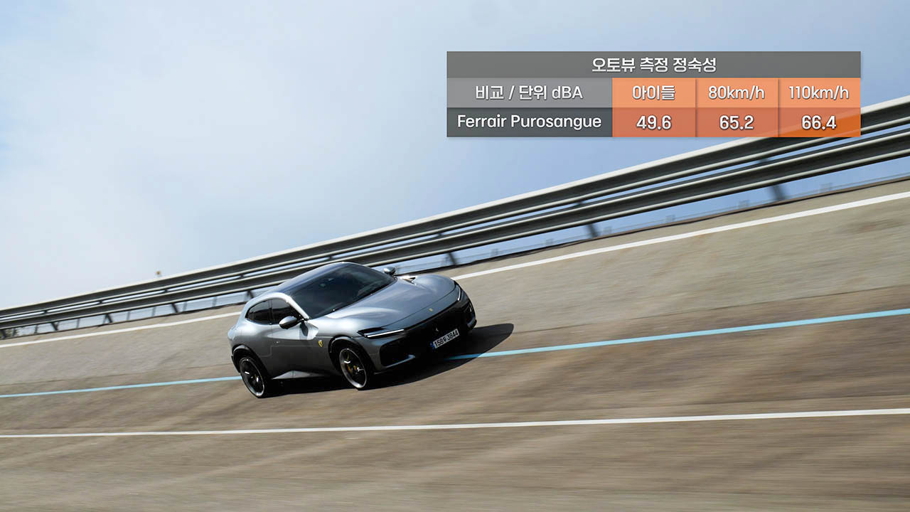 한편 푸로산게가 110km/h로 달릴 때의 소음은 66.4dBA 수준으로 80km/h 주행 때와 큰 변화를 느끼기 어려웠다. 푸로산게는 두터운 측면 유리를 가졌는데 약 6mm 정도의 두께를 가진 것으로 나타났다. 정차 상태의 아이들 소음은 49.6dBA로 컴포트 모드 기준이며 스포츠 모드로 배기 플랩을 열면 곧바로 55.7dBA까지 오르며 V12 엔진의 존재감을 느끼게 해줬다.