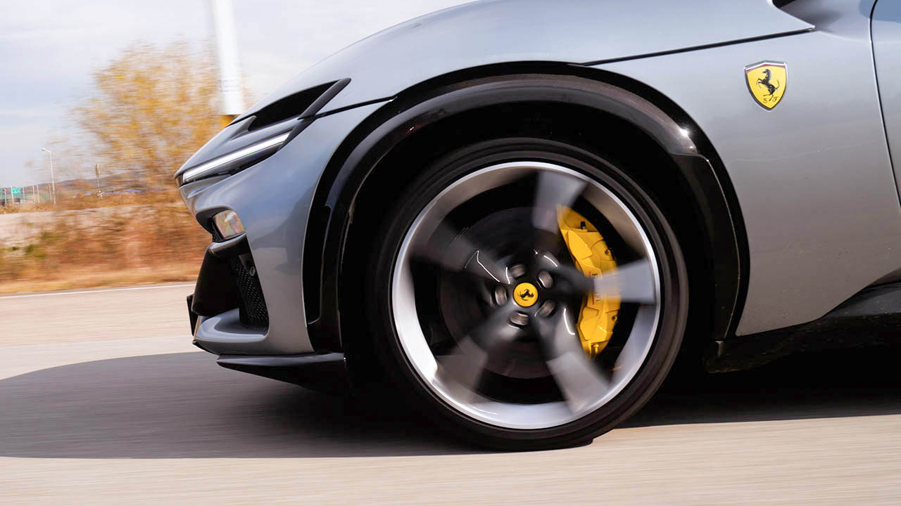 스티어링을 꺾은 채 가속 페달에 발을 올려 후륜 타이어의 접지력 한계에 도달하는 중이다. 이때 후륜 축에서 미끄러짐을 준비하는 움직임이 쉽사리 느껴진다. 푸로산게의 전자식 LSD가 후륜 축을 단단히 쥐며 V12 엔진의 출력을 통제 가능한 수준으로 후륜 타이어에 보내기 위함이다.