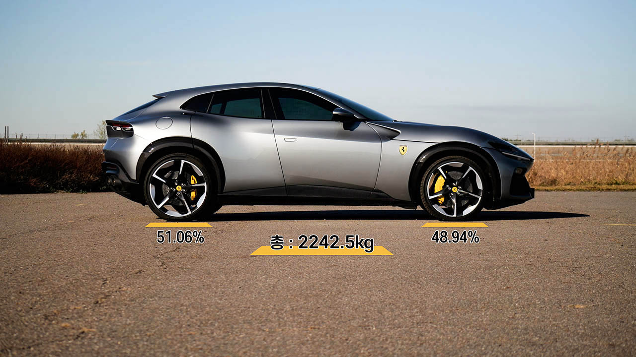 중량 배분은 실계측 기준 전륜 48.94%로 확인됐는데 제원상 배분은 49:51로 유사값이 측정됐다. 전륜 축을 기준으로 깊숙이 안쪽으로 자리한 V12 엔진, 변속기를 후륜축에 갖춰 이상적인 배분을 갖게 된 것이다.