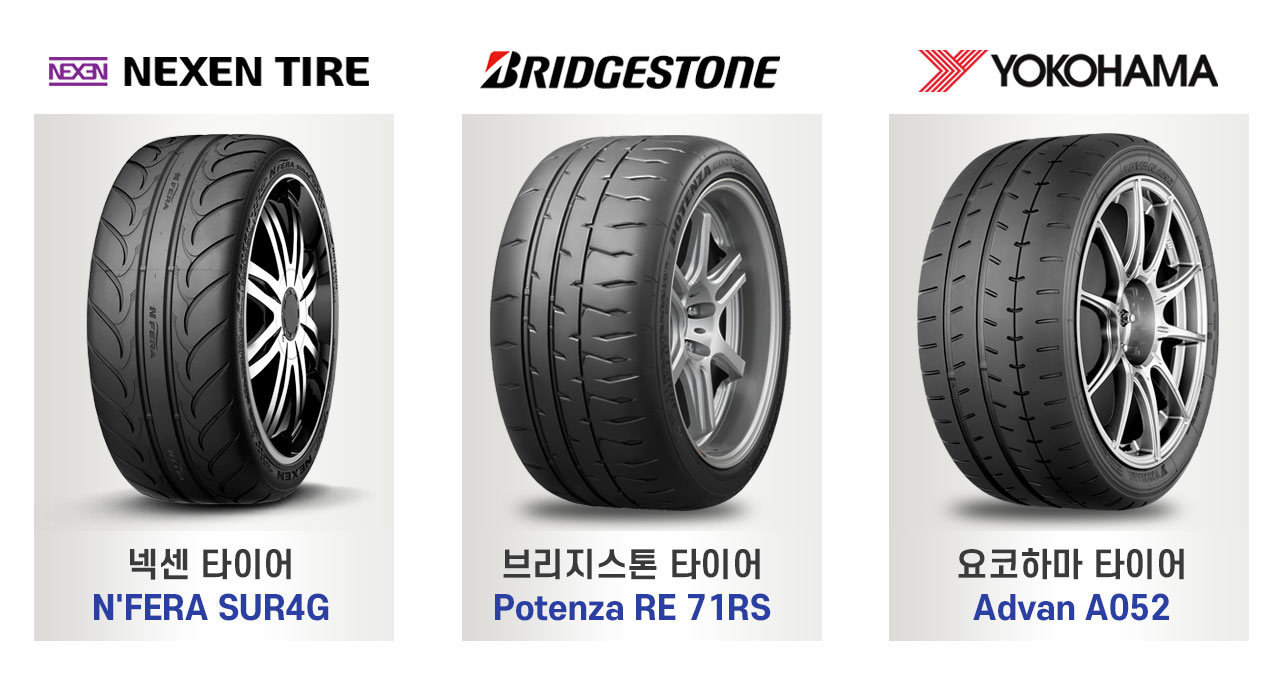 다른 비교 대상으로는 스포츠 타이어로 유명한 요코하마가 만든 서킷용 타이어 어드반 A052를 택했다. 또 국내서도 원메이크 레이스에 공급된 바 있는 브리지스톤의 포텐자 RE71RS가 비교 대상이다. 참고로 이 타이어들은 모두 제조사 및 수입사가 제공해 줬다.