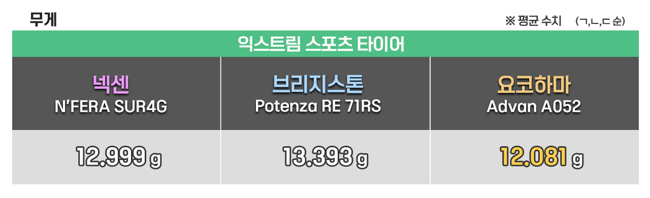 우리는 타이어 무게를 가장 가벼운 것과 무거운 것의 차이로 확인하고 있다.