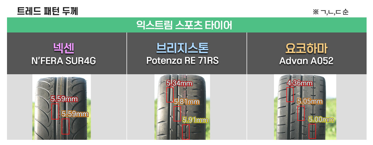 그러나 트레드가 얇다는 것은 상대적으로 짧은 수명을 예상하게 만들기에 2025년 시험부터는 트레드 두께도 비교 항목에 넣기로 했다.