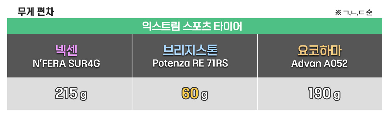 최소한의 양산 품질 확인을 위해 각 타이어별 무게 편차도 봤는데, 여기서는 브리지스톤 RE71RS의 편차가 가장 적은 것으로 나왔다.
