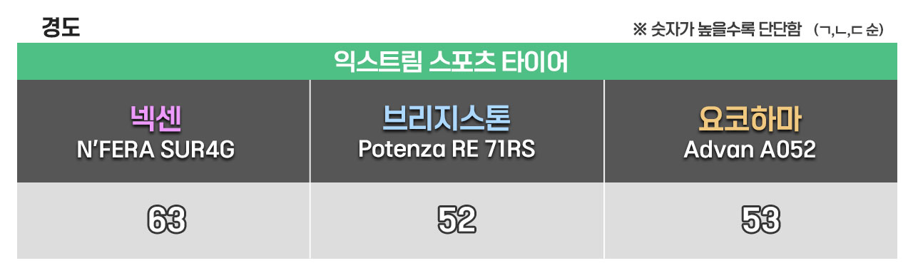 타이어 패턴의 단단함도 확인했는데, 넥센이 가장 단단했으며 요코하마와 브리지스톤이 유사한 수준으로 나왔다. 타이어의 단단함은 평가 항목이 아니다.