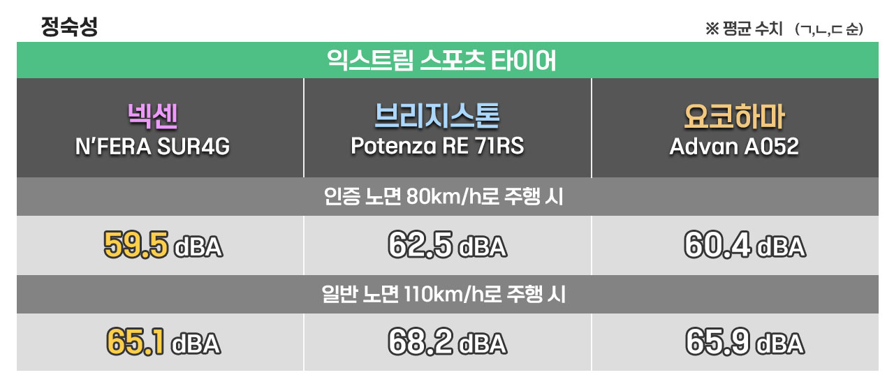 서킷용 타이어에서 중요한 것은 아니지만 소비자 입장에서는 중요한 항목이 될 수 있다. 주행하는 동안의 소음이 스트레스를 유발할 수 있기 때문이다. 시험 결과 넥센이 가장 조용했으며 브리지스톤이 가장 소음이 많은 것으로 나타났다.