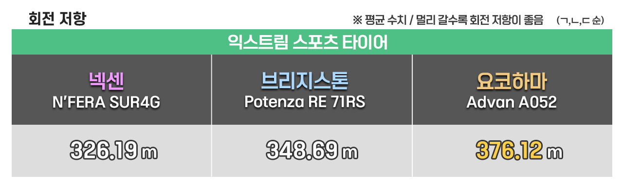 가장 멀리 간 것은 A052로 평균 376m를 기록했다. 다음은 RE71RS로 348m를 달렸다. SUR4G는 평균 326m 내외를 기록했는데, 상대적으로 노면 저항이 많았다고 볼 수 있다. 시험은 변속기를 중립(N)으로 설정한 뒤 40-0km/h까지 이동한 거리를 측정하는 방식을 썼다.