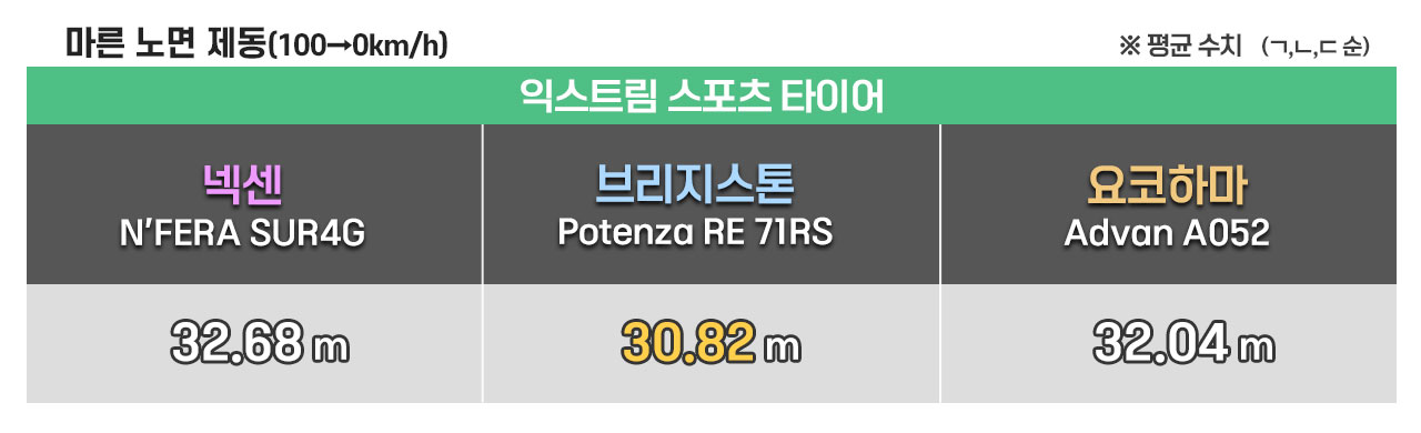 제동력 측정 결과 브리지스톤의 RE71RS가 가장 짧은 30.8m 수준의 제동거리를 나타냈다. 각 제동 간 편차도 적었다. 요코하마 A052는 32m 내외, 넥센 SUR4G는 약 32.7m 내외 수준의 평균 제동거리로 순위를 이었다.