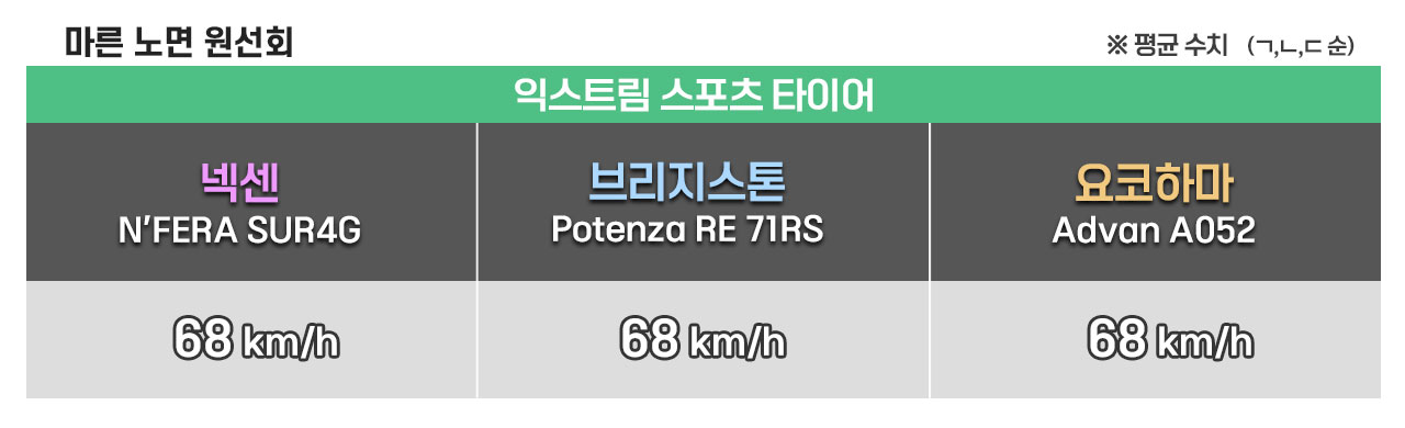 이 시험이 각 타이어의 절대적인 코너링 한계를 의미하지는 않지만 참고치로는 충분히 활용할 수 있다. 시험 그 결과 3사의 타이어 모두 평균 68km/h 정도를 버텨냈다. 한계에 들어서면서 나오는 (스티어) 특성 차이는 있었지만 대부분 유사한 횡그립 레벨을 가졌다고 보면 된다. 물론 미끄러짐 현상이 있음에도 더 높은 속도까지 버텨내는 타이어도 있지만 타이어의 큰 마모를 동반하는 비정상 환경이라는 점을 감안, 그립 한계 이후는 성능 평가에 포함시키지 않았다. 만약 일정 수준의 슬립 앵글 이상을 범위에 넣었다면 RE71RS가 A052 대비 미소 우위를 점했을 가능성이 있긴 하다.