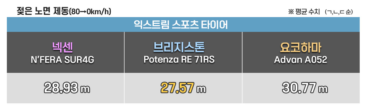 젖은 노면 제동력은 트레드 패턴의 두께 및 디자인, 소재에 따라 차이가 나는데 여기서도 RE71RS의 성능이 가장 좋게 나왔다. RE71RS가 기록한 것은 평균 27.6m 내외. 다음은 넥센의 SUR4G였는데 평균 28.9m, 그리고 A052가 30.7m 내외로 가장 긴 제동거리를 나타냈다.