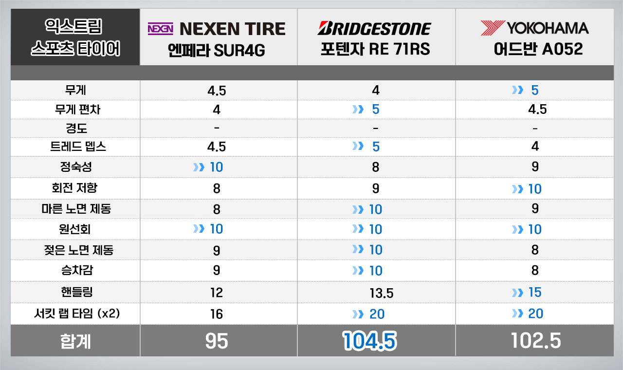 본격 서킷용 타이어라는 점을 감안해 테스트에 따른 점수도 2배로 늘렸다.