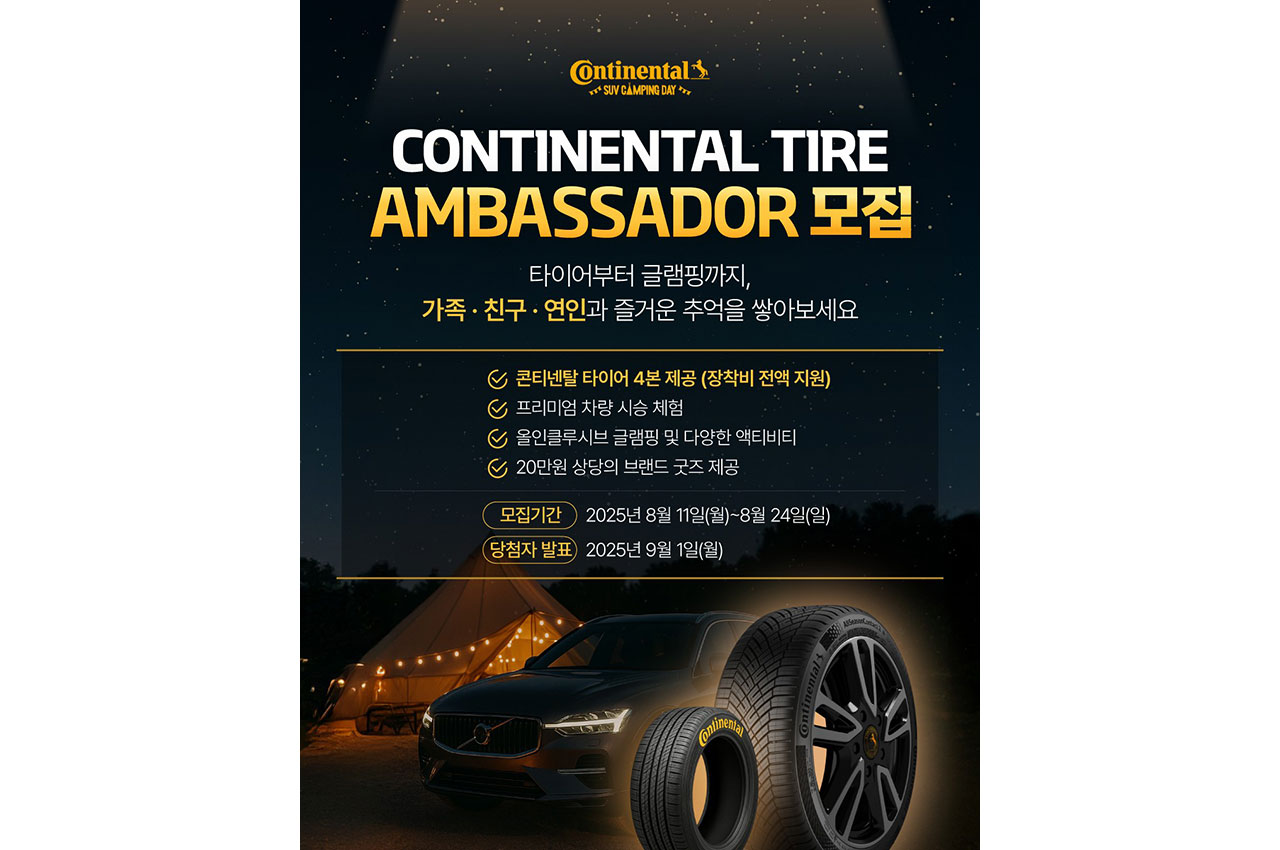콘티넨탈은 앰버서더 프로그램을 통해 참가자들에게 오는 10월부터 약 3개월간 일상 주행 및 글램핑 등 타이어 제품 성능을 경험할 수 있는 다양한 기회를 제공한다.