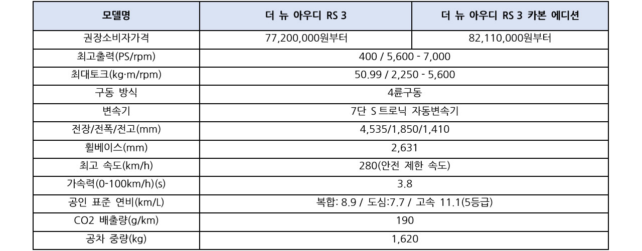 - 더 뉴 아우디 RS 3 카본 에디션 : 82,110,000원