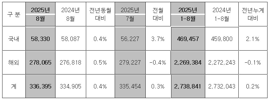 현대자동차가 2025년 8월 국내 5만 8,330대, 해외 27만 8,065대 등 전 세계 시장에서 전년 동월 대비 0.4% 증가한 총 33만 6,395대를 판매했다.