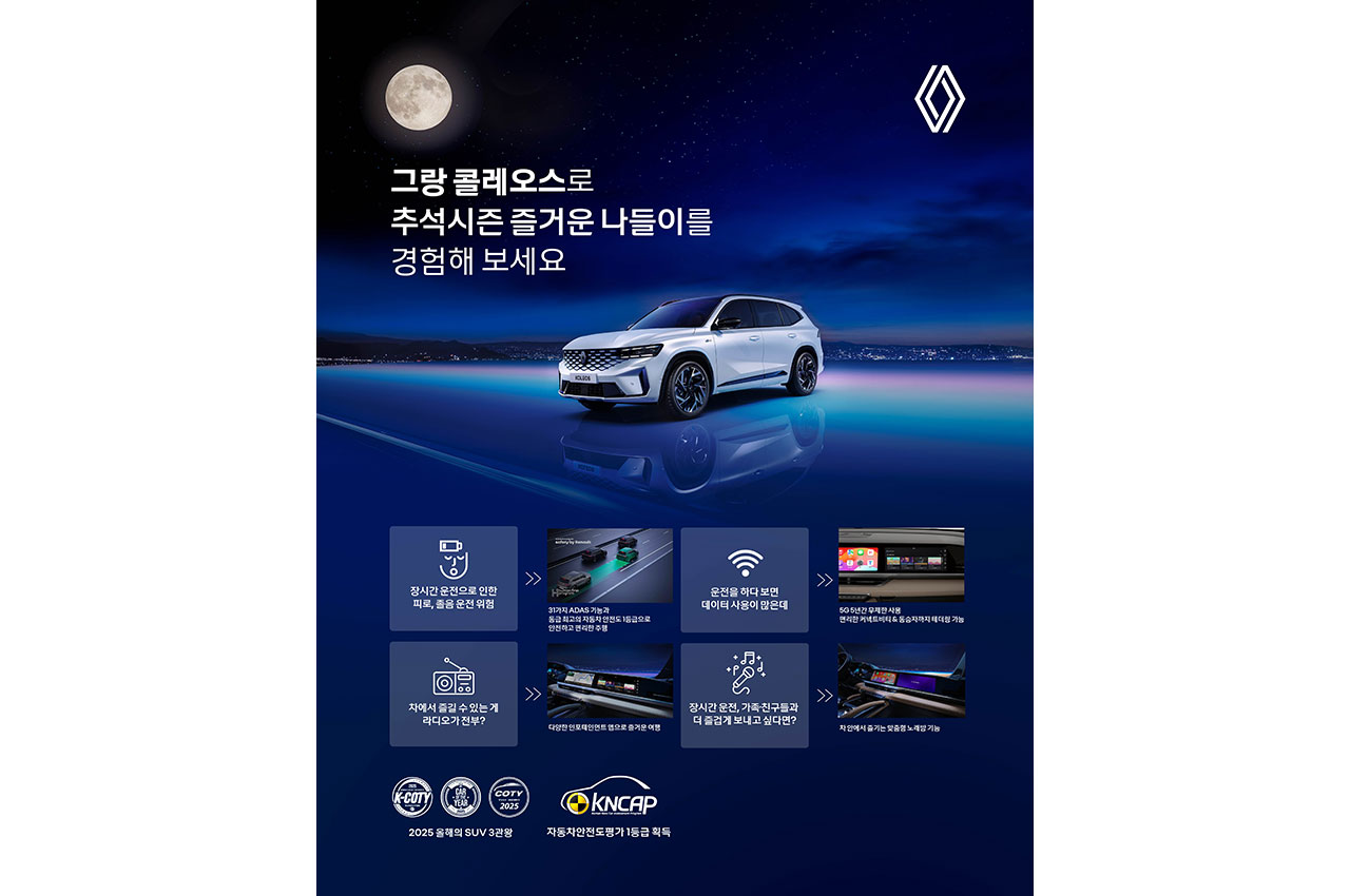 여기에 더해, 그랑 콜레오스, 세닉 E-Tech 100% 일렉트릭(이하 세닉 E-Tech), 아르카나의 시승 또는 구매상담 및 계약 중 한가지를 진행한 고객에게는 추첨을 통해 ▲ 주유 상품권 10만 원권(30명) ▲ 다이슨 무선 청소기(2명) ▲ 6박 7일의 르노코리아 차량 장기 시승권(10명) 등 푸짐한 경품을 제공한다.