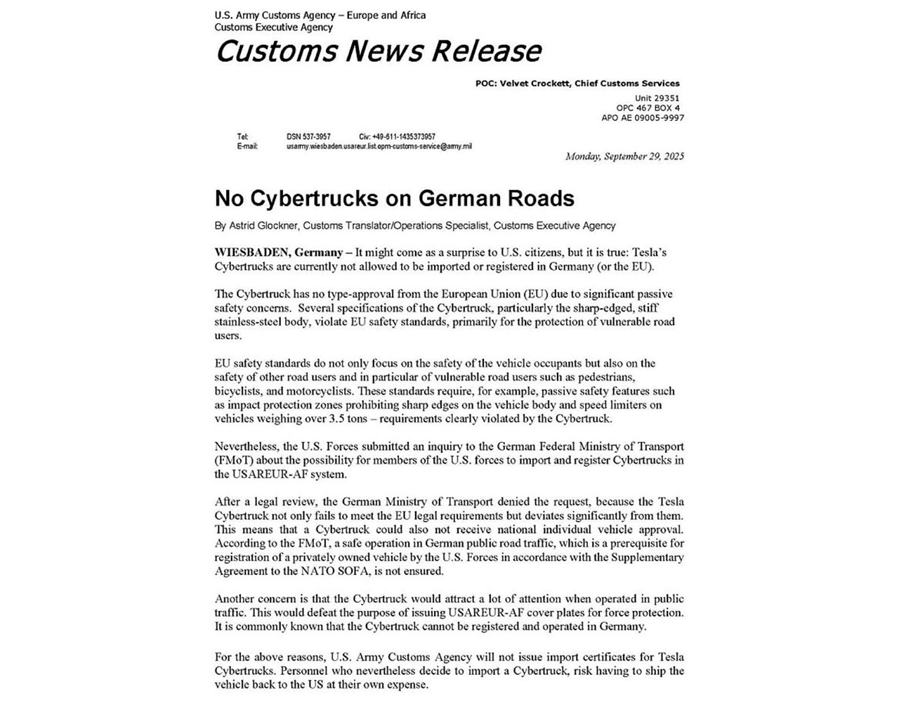 미 육군이 해외 주둔이 확정된 군인들을 대상으로 테슬라 사이버트럭의 유럽 반출 및 등록을 금지한다고 발표했다. 이유는 유럽의 도로, 교통 환경에 해당 차량이 부합하지 않기 때문이다.