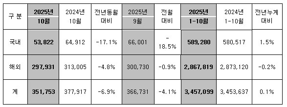 현대자동차가 2025년 10월 국내 5만 3,822대, 해외 29만 7,931대 등 전 세계 시장에서 전년 동월 대비 6.9% 감소한 총 35만 1,753대를 판매했다.