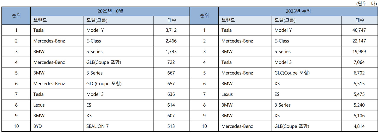 10월 베스트셀링 모델은 테슬라 Model Y Long Range(2,424대), 메르세데스-벤츠 E 200(1,383대), 비엠더블유 520(1,308대) 순이었다.