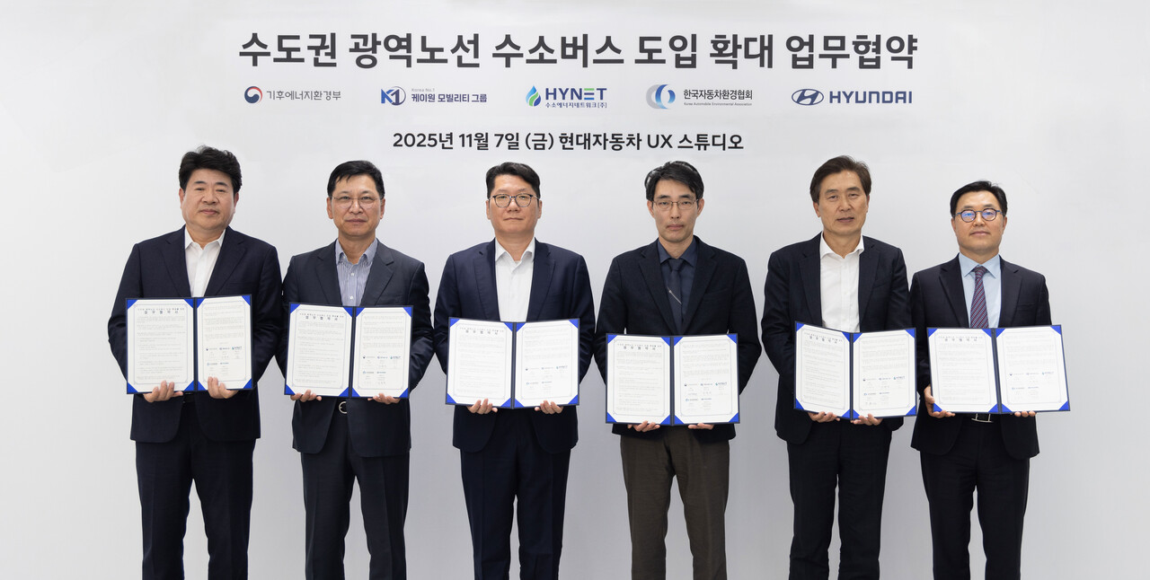 현대차는 7일(금) 현대차 강남대로 사옥에 위치한 UX 스튜디오 서울에서 기후에너지환경부, K1 모빌리티 그룹(이하 K1 모빌리티), 하이넷(수소에너지네트워크), 한국자동차환경협회와 ‘수도권 광역노선 수소버스 도입 확대를 위한 업무협약’을 체결했다.