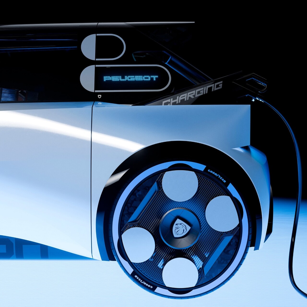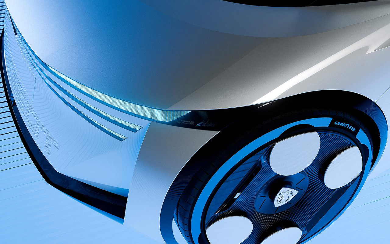디자인은 마이크로-LED를 활용해 푸조의 새로운 디자인 콘셉트를 구현했다. 푸조만의 세 갈래 발톱 모양 라이트 시그니처는 수평 레이아웃으로 재해석돼 존재감을 드러낸다. 마이크로-LED 기술은 전면 및 후면과 C필러에도 적용되어 충전상태표시 등 새로운 기능을 제공한다. 정지 시에는 전후면에서 그래픽과 색상 애니메이션이 출력되며 독특한 시각 경험을 제공해 브랜드 아이덴티티를 강화한다.