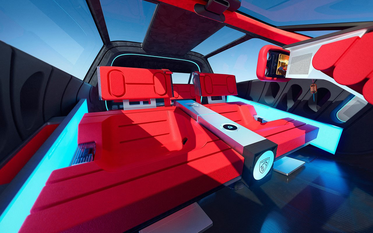 실내는 차세대 푸조 아이-콕핏(i-Cockpit®)을 제시한다. 주행 정보는 하이퍼스퀘어 뒤의 마이크로-LED 패널을 통해 앞유리에 투사된다. 이 디스플레이는 31인치 화면으로 주행 몰입감을 제공한다. 주행 중에는 크루즈, 펀, 하이퍼 3가지 주행 모드에 따라 실내외 시각 효과가 동기화되어 운전자의 주행 감각을 만족시킨다.