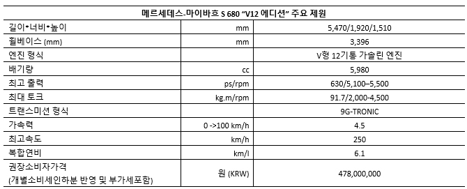 지난 9월 이탈리아 치비타베키아의 역사적인 미켈란젤로 요새에서 공개된 메르세데스-마이바흐 V12 에디션은 전세계에 시장에 단 50 대 한정 판매되며, 한국 시장에는 10대가 출시된다. 국내 고객에는 내년 1월 인도 예정이며, 차량의 가격은 4억 7,800만원(개별소비세 인하분 반영 및 부가세 포함)이다.